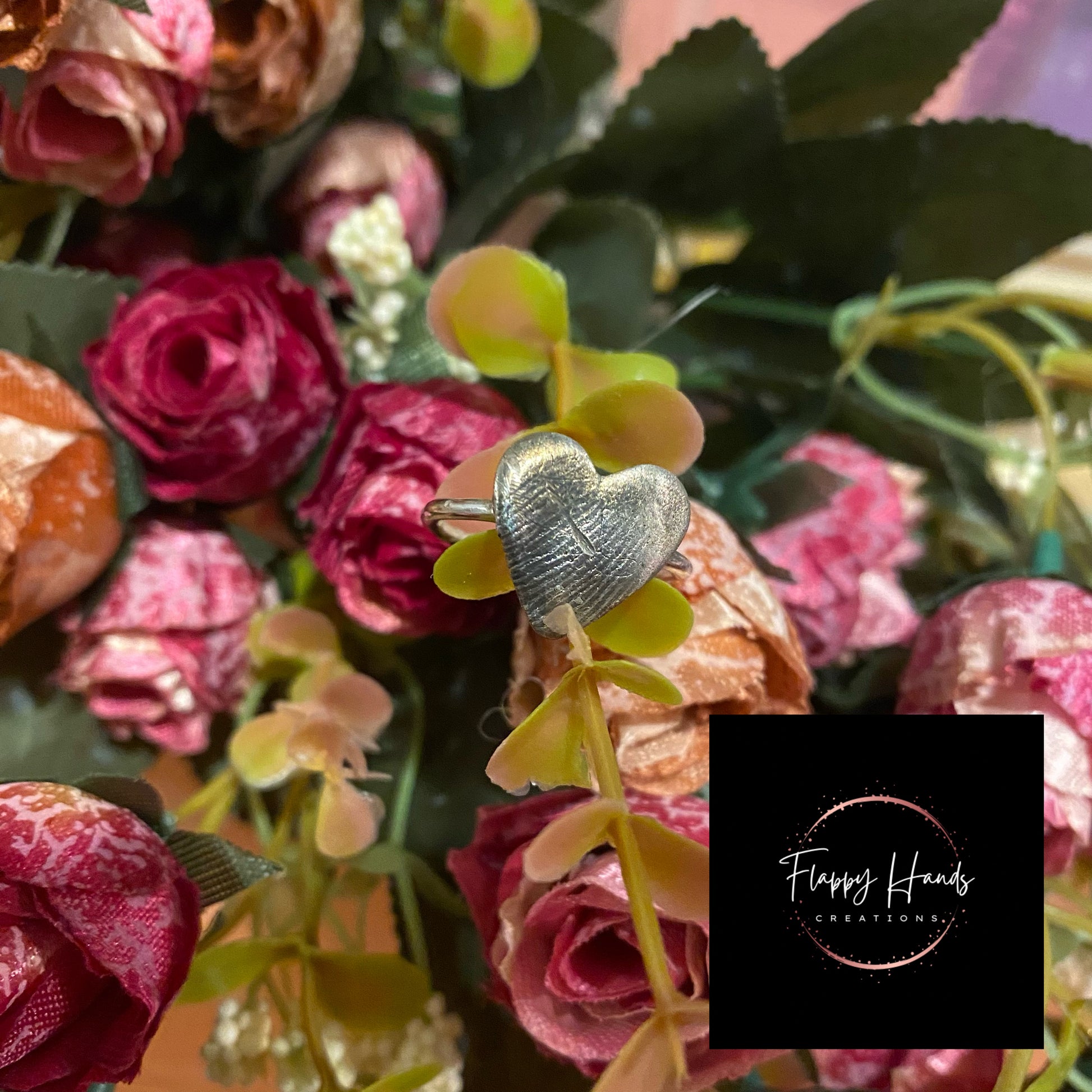 The fingerprint is made using fine silver metal clay and the band is sterling silver. This print style was made using direct finger print. There’s a couple different ways I can make a fingerprint ring. I can take your print directly if you’re local, but if you’re not local, I can send you a mold where you’ll press your finger into it and send it back to me and I’ll create a silicone finger from that mold to use as the direct print. Your other option is to send me a picture of your print using ink. Pictures of prints will have a different look compared to the direct prints but it’s a great alternative and leaves options open so this keepsake is more accommodating to your needs and circumstances. Please message me on Facebook (Flappy Hands Creations) or email me at flappyhandscreations@gmail.com to discuss details and how you prefer to have this made.