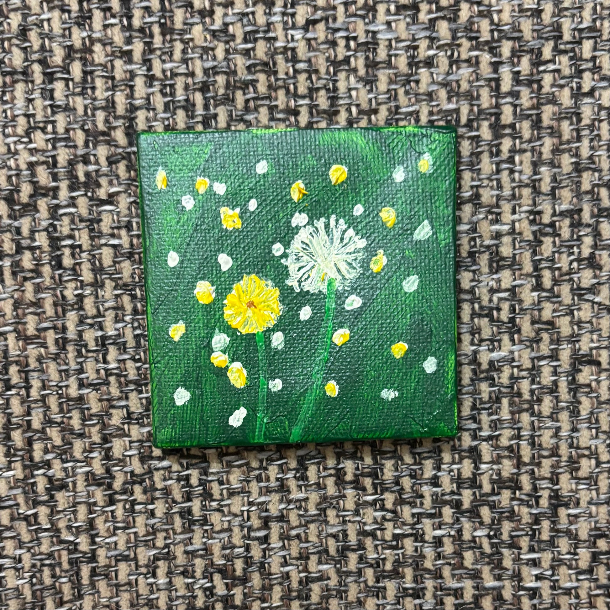 This is a 2.5x2.5 inch mini canvas magnet hand painted using acrylic paint. This painting is of dandelions.
