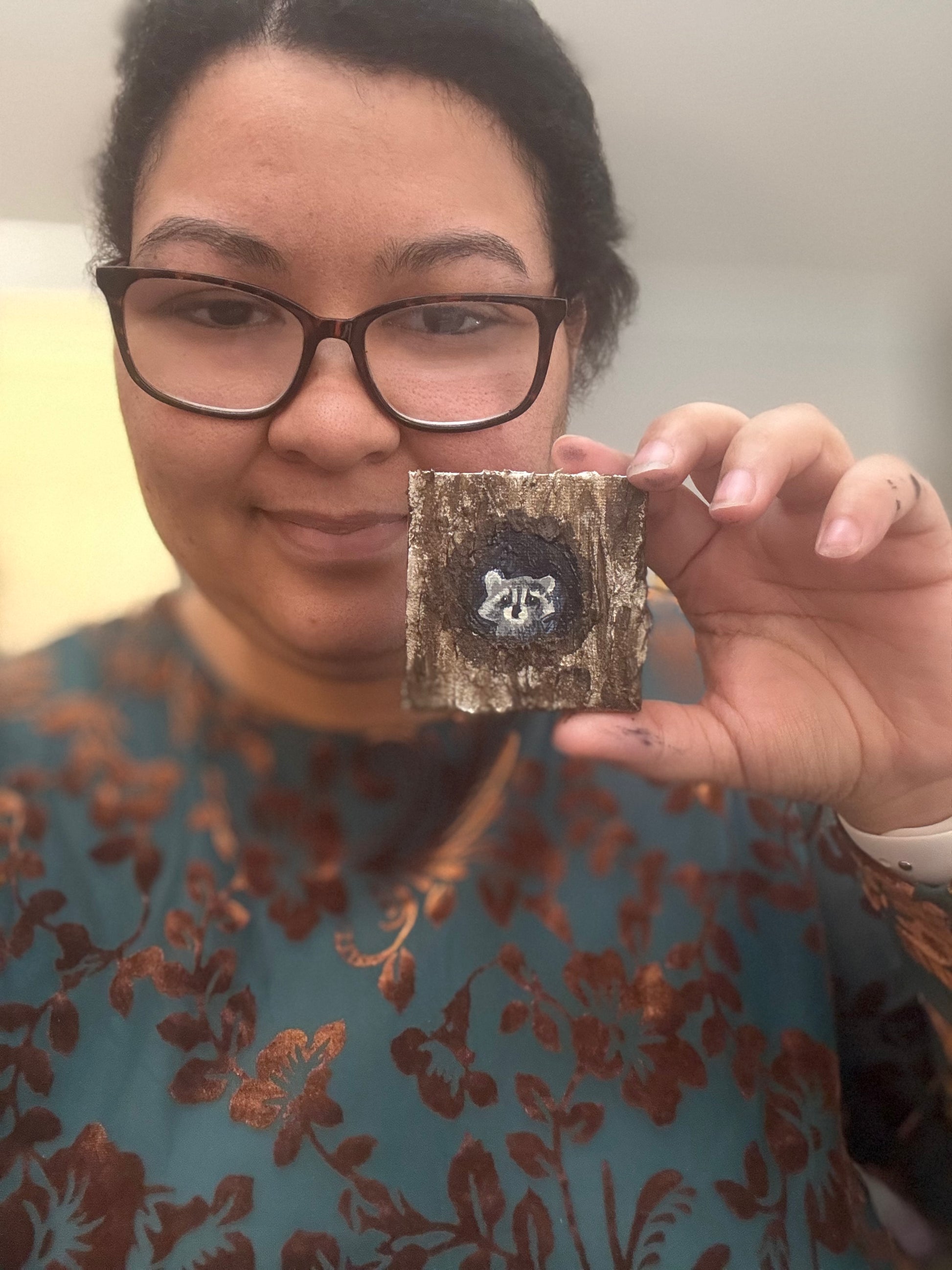 This is a 2.5x2.5 inch mini canvas magnet hand painted using acrylic paint. This painting is of a textured tree and raccoon.